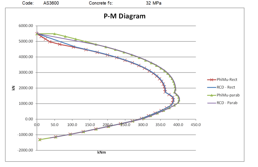 The graphs below compare moment vs axial load results using the rectangular and parabolic-linear stress blocks for circular sections with low and high concrete strengths to the three codes.