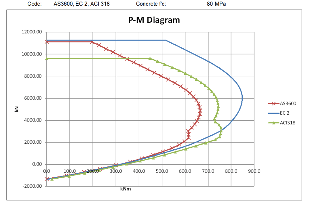 For the lower strength concrete the AS 3600 and ACI 318 are very close for high axial loads and zero axial load to maximum tension, but for intermediate axial loads the ACI results are significantly higher. This is because of the different procedures for calculating the transition of the capacity reduction factor from 0.85 to 0.65. For the high strength concrete the ACI results are significantly higher than AS 3600 over the full range of compressive axial loads up to the ACI maximum.