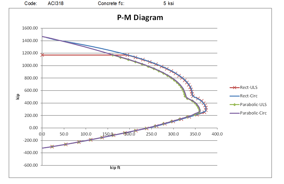The graphs below compare moment vs axial load results using the rectangular and parabolic-linear stress blocks for circular sections with low and high concrete strengths to the three codes.