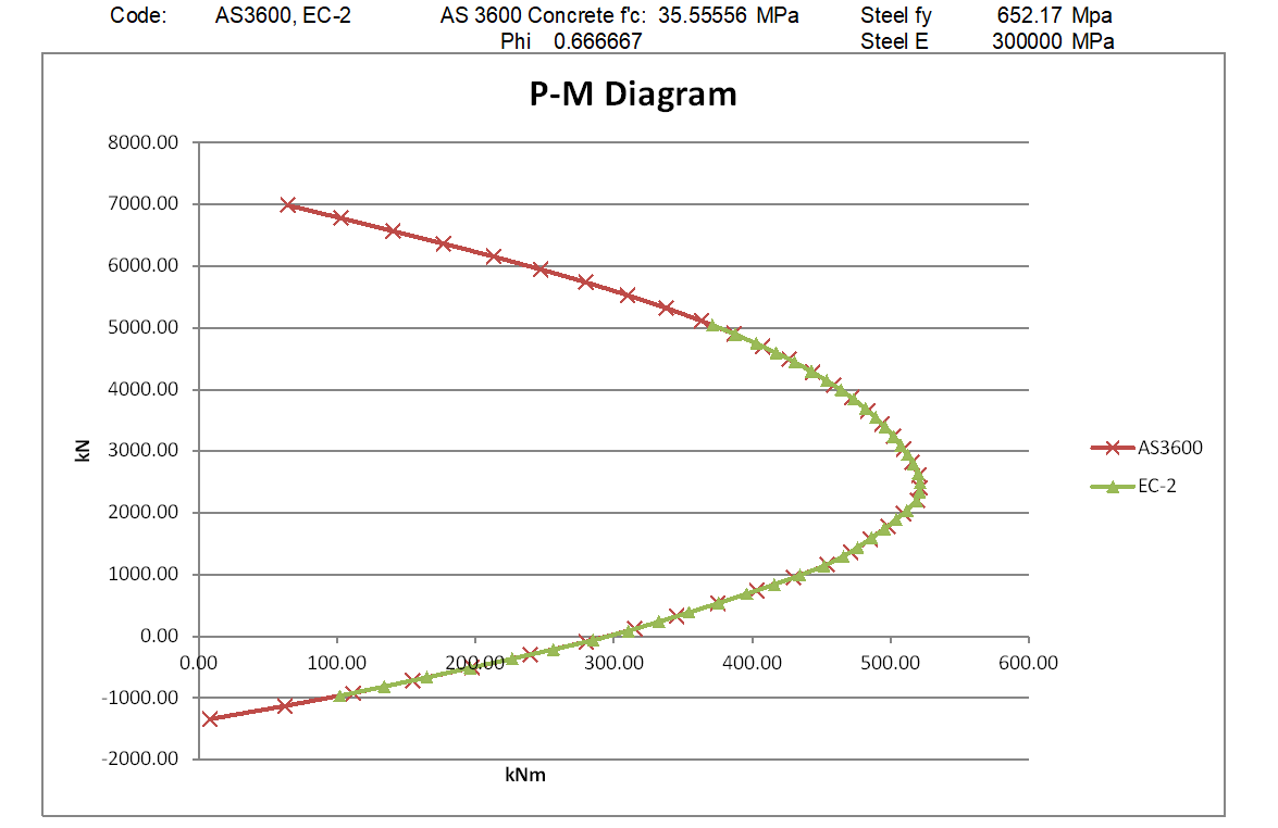 However if in AS 3600 the global reduction factor is set to 1/1.5, with the steel yield strength factored by 1.5/1.15, and the concrete strength factored by 1/0.9, so the nett material properties after factoring are the same as in the Eurocode analysis, the results are different: