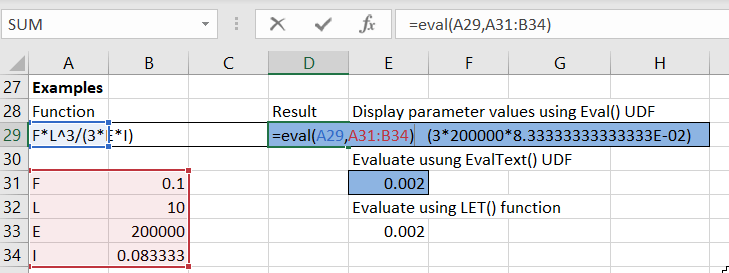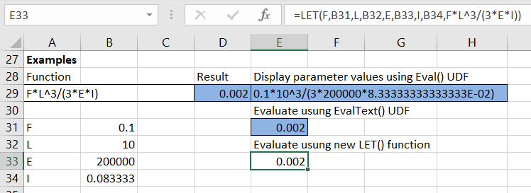 The screenshot below shows the function “FL^3/(3*E*I)” evaluated with the Eval UDF and the Let function: