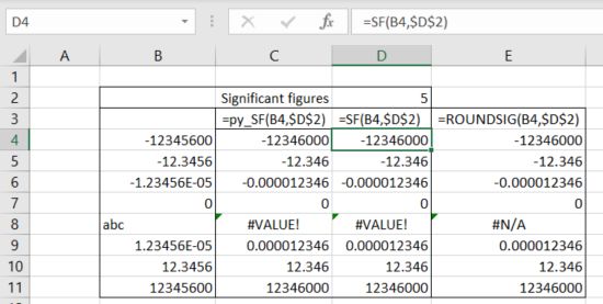 Excel does not have a function to round numbers to a specified number of significant numbers, and (rather to my surprise) neither does Python. It is not too hard to write an on-sheet formula to do the job, but it is much more convenient to use a short user defined function (UDF):