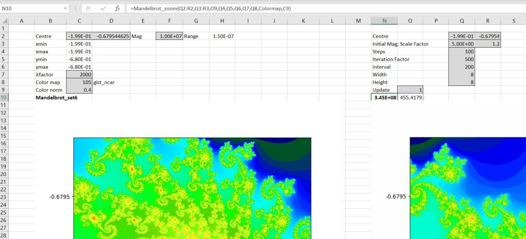 The Matplotlib animation functions also allow much smoother animations of the Mandelbrot Function than can be achieved with the VBA code I posted last year. The screenshot below shows input for generating a single Mandelbrot image on the left, and an animation zooming in on any defined point on the right: