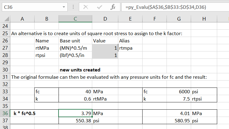 A new example has been added, illustrating how to work with formulae that have constants with implied units, using as an example finding the tensile strength of concrete based on a constant times the concrete’s compressive strength:
