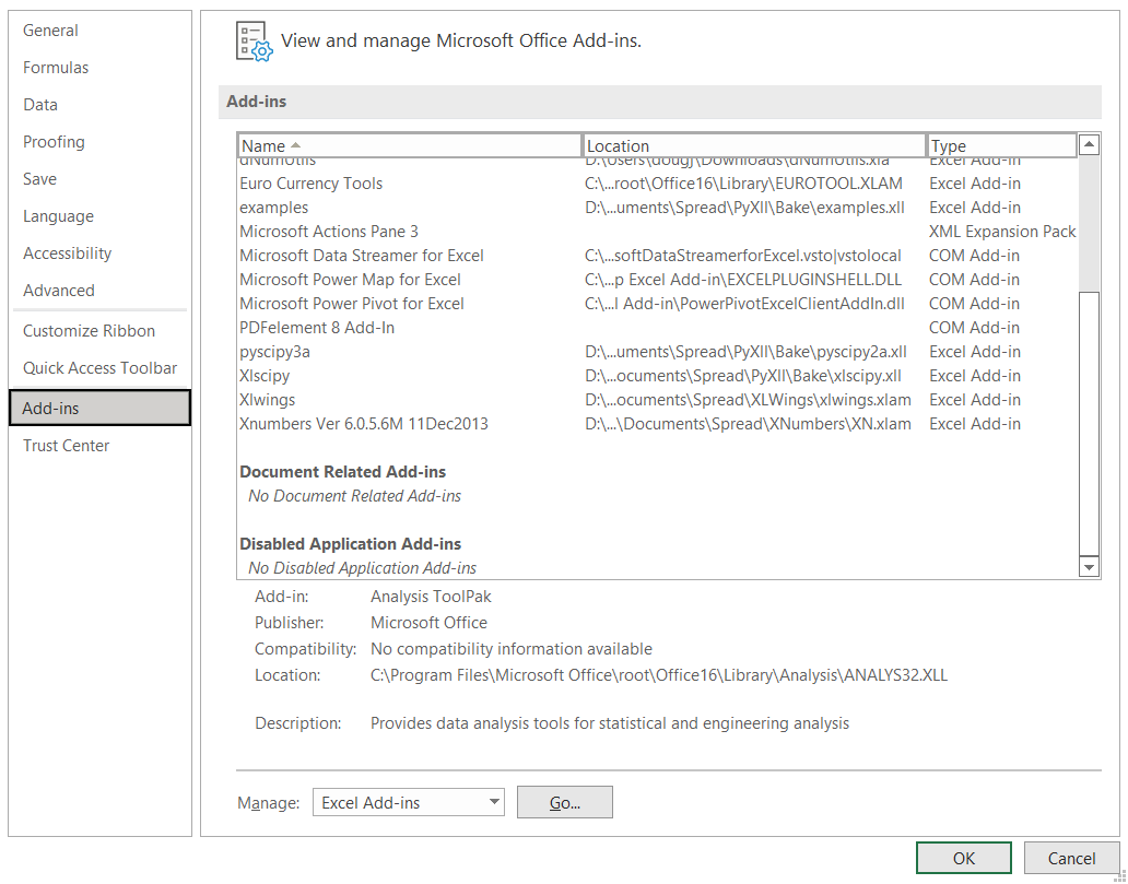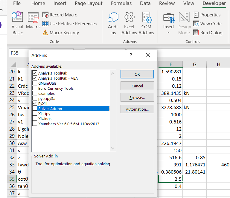 Recently I found that for unknown reasons the Excel Solver add-in was not working. Opening the add-ins list from the Devloper tab showed that it had become deactivated (also accessible from File-Options-Add-ins):