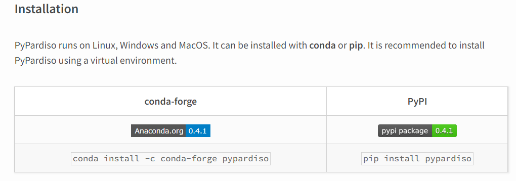 For my linear algebra functions based on the Scipy library I have also installed PyPardiso which provides substantially better performance than the Scipy functions for solving large sparse systems. As reported here I previously found I had to search for a non-standard conda library for the installation, but this time the latest documentation recommended installation with pip: pypardiso 0.4.1