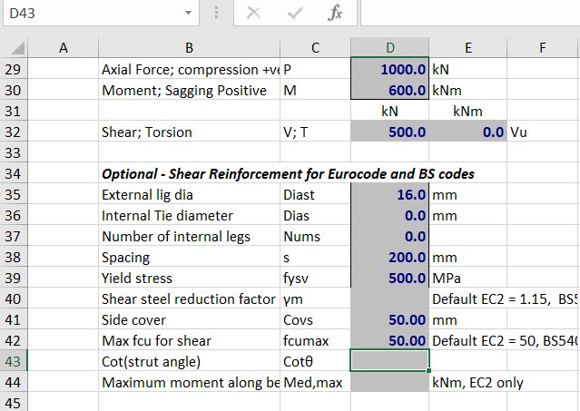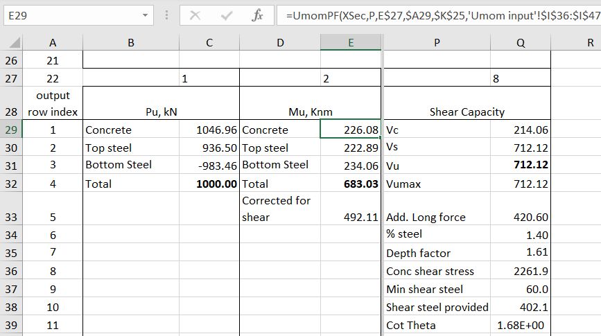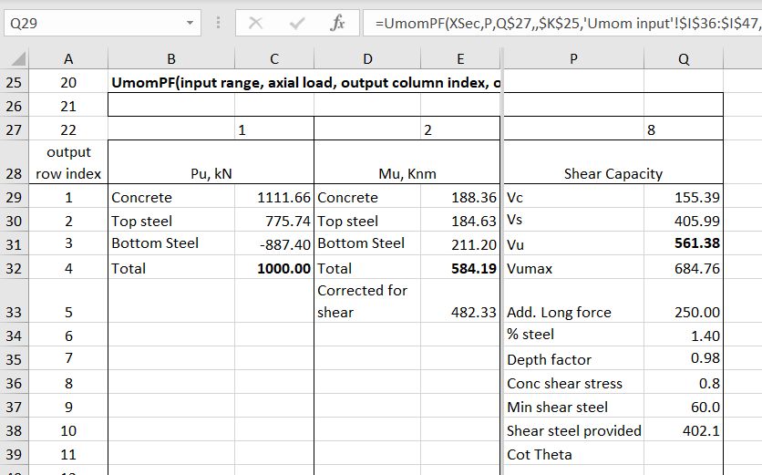 The UMomPF function returns ultimate bending and axial load capacity to the Eurocode 2 and BS 5400 design codes. It has now been updated to also return shear capacity, and modified bending capacity, allowing for the additional tensile force in the longitudinal steel due to the shear force. Note that in the current version there is no provision for design for torsion.