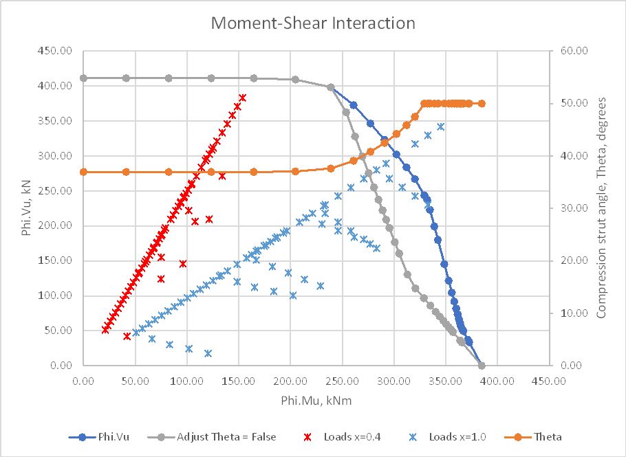 Plotting the section capacity as a moment-shear interaction diagram allows the loads from all sections with identical reinforcement to be plotted on the same section, and load cases where the applied loads exceed the section capacity are immediately visible.