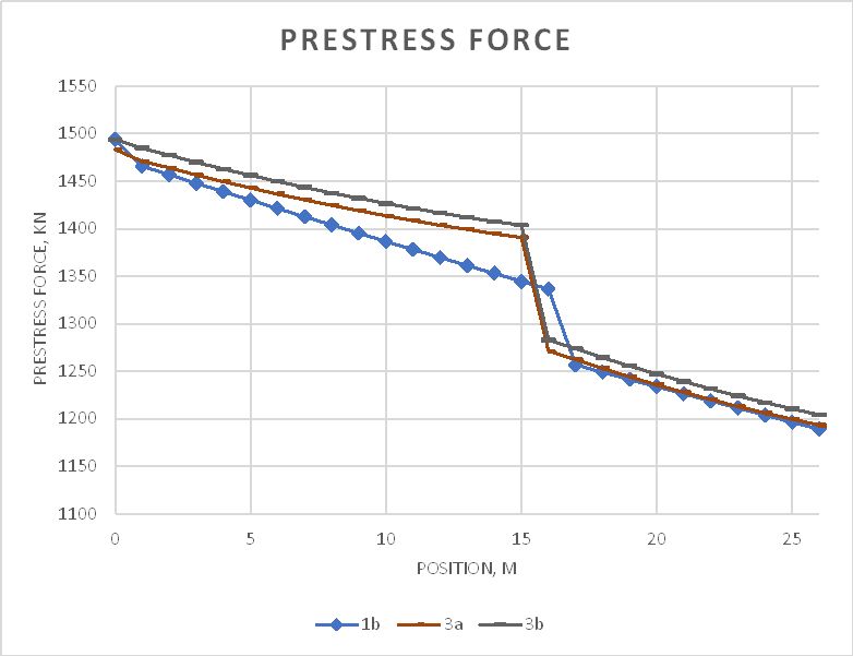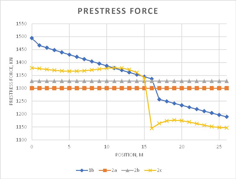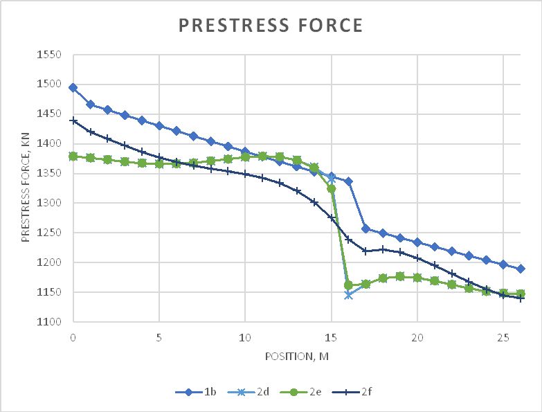 - For model 2f the prestress was applied as a different load for each segment. The resulting load followed the trend of loads calculated with AS 3600 friction losses, but was significantly lower over the full length, resulting in significantly lower bending moments at each section, compared with 1b. In future analyses the prestress load will be adjusted for this case, so that loads are equal to the required values after transfer.