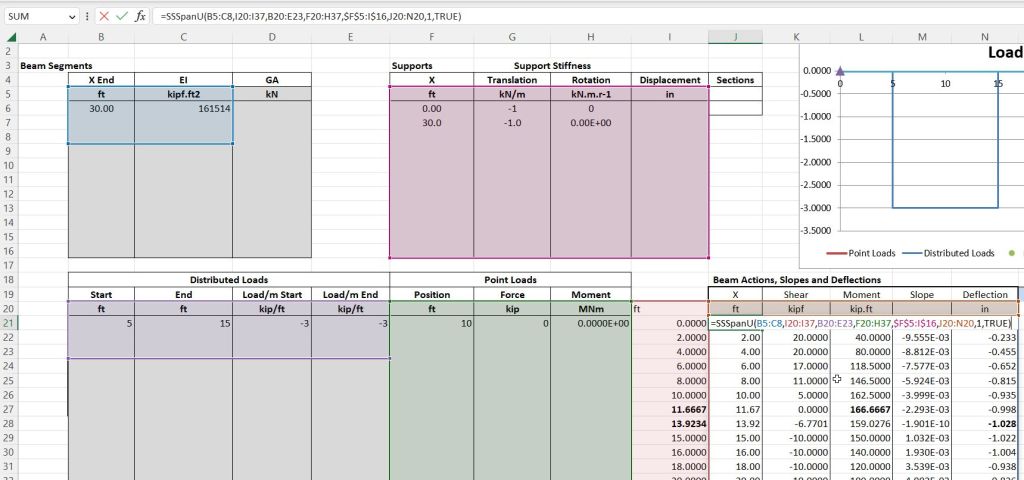 The Eng-Tips discussion linked above concerned ways of finding the maximum deflection of a beam under non-symmetrical loading. This can be easily done using the SSpanU function together with the Excel Solver. A similar procedure can also be used with the ConBeam function. Input for an example beam is shown below (click image for full size view):