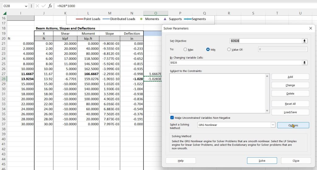 By inspection, the maximum deflection was seen to be between 13 and 14 ft from the left support. To use the Solver the deflection output for 14 ft has been multiplied by 1000 in cell O28. This is used as the Solver “objective value”. The Solver is set to minimise this value by changing the output location in cell I28. The Solver adjusts the value to 13.9234, with a deflection of -1.028 inches.