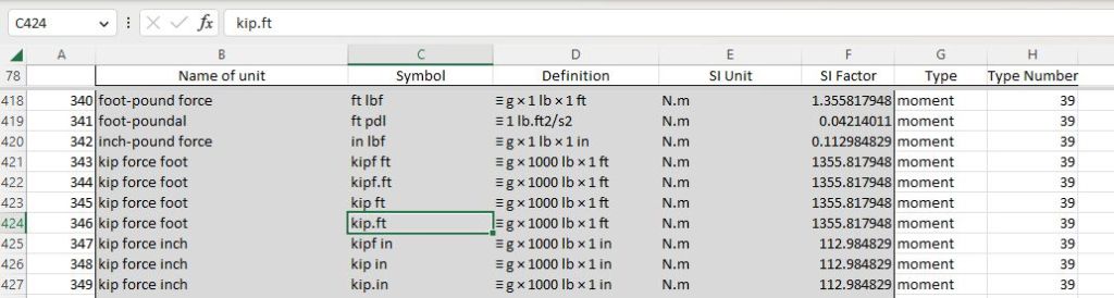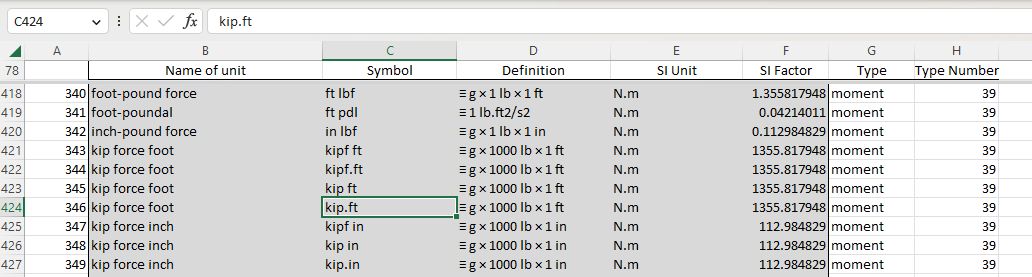 Non-SI units are listed on the Ext Unit List sheet. Adding new abbreviations to this list is easy. The example below shows kip.ft added to the list: