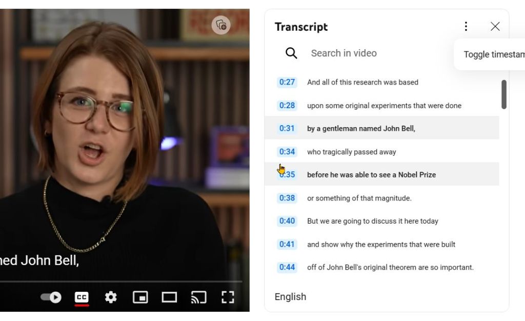 … and the transcript is displayed to the right. You can then click on the three vertical dots to the top-right of the transcript and select toggle time-stamp.
