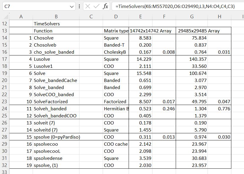 The files presented in the recent post on Scipy Linear Algebra Solvers include a wide range of different solver types, with in some cases numerous sub-options, allowing the functions to be called from Excel, and greatly extending and speeding up Excel’s limited solver functions.