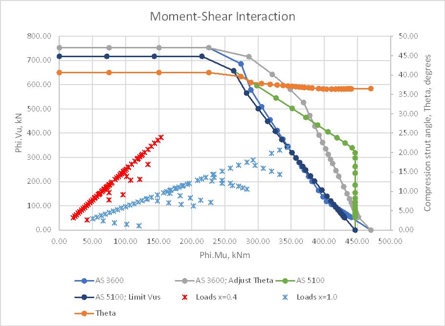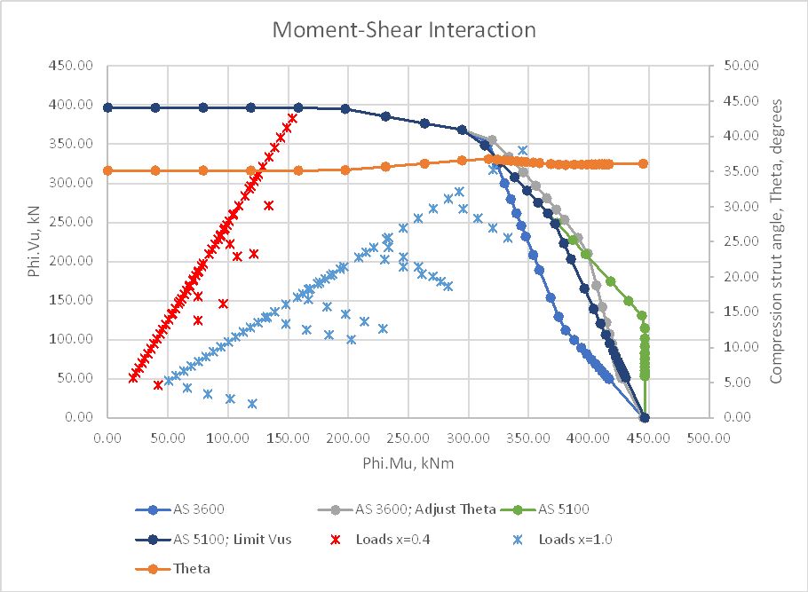 Examples of this function are shown below, comparing AS 3600 (with and without adjustment of the compression strut angle) with AS 5100.5 (with and without a limit applied to the value of Vus). In the first examples the reduction factors for bending and shear have been adjusted in the AS 3600 results so that the only difference between the two codes is in the treatment of longitudinal loads due to shear.
