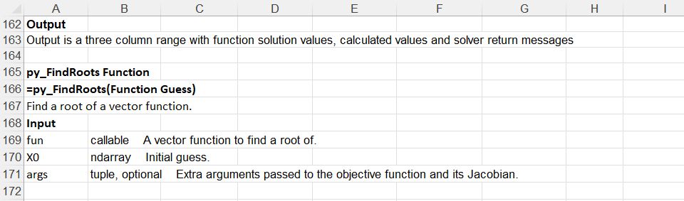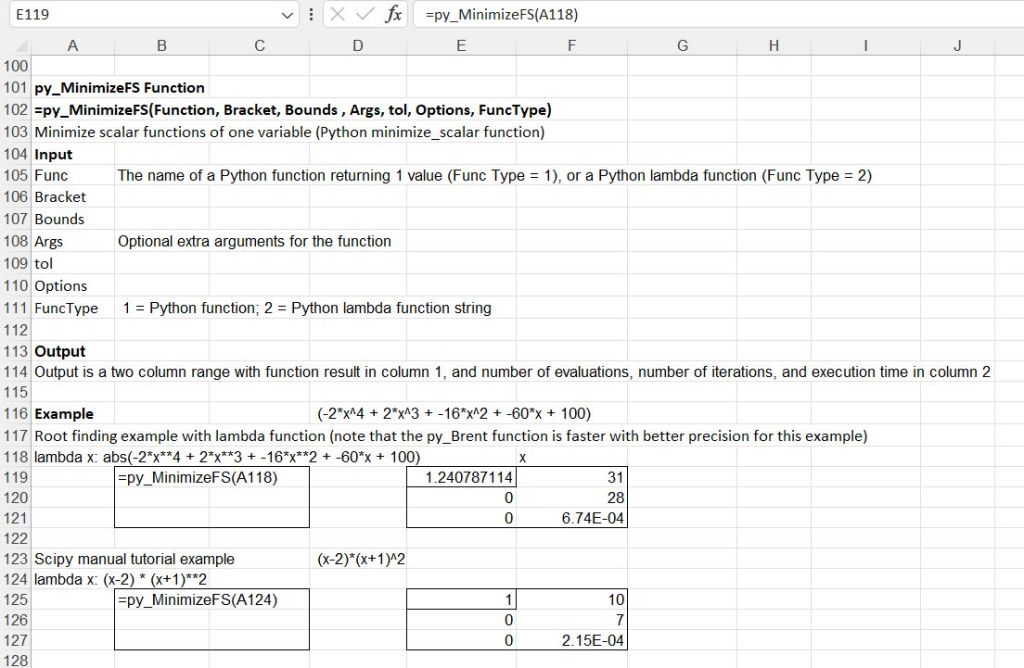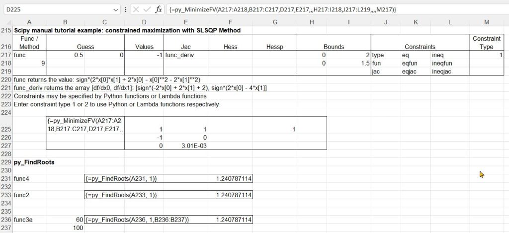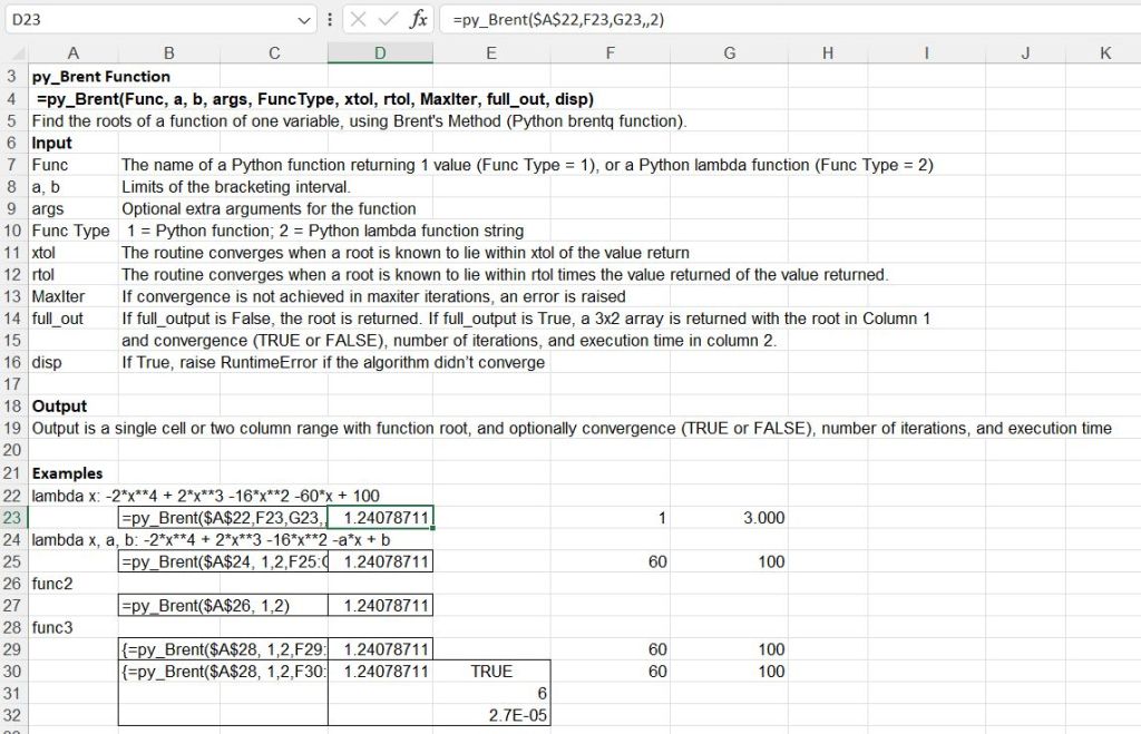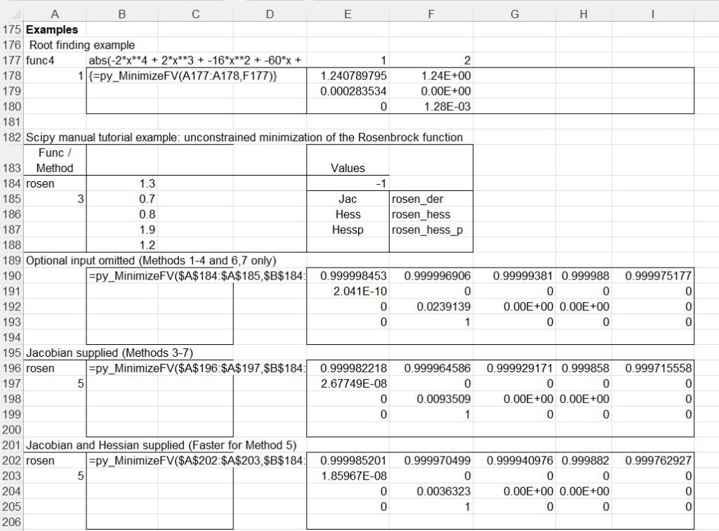 Examples in the spreadsheet include the root finding example used for the py_Brent function, and more complex examples from the Scipy documentation: