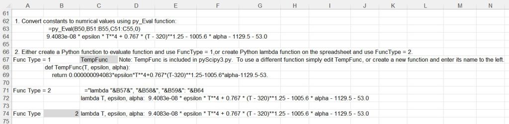 The function may either be entered as text on the spreadsheet using the Python lambda format, or may be the name of any accessible Python function. In the example above func2 and func3 are included in the pyScipy3 module: