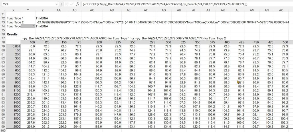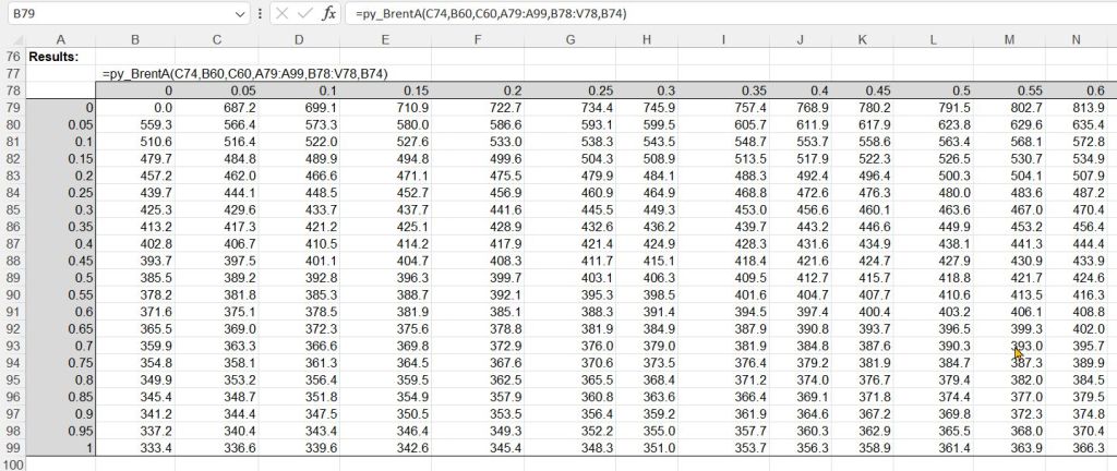 The py_BrentA function allows two of the function arguments to be transferred as row and column arrays, with the result returned as a table: