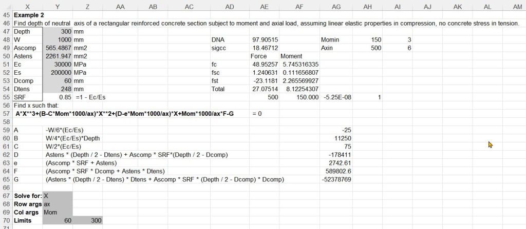 The second example finds the depth of the Neutral Axis of a reinforced concrete section with elastic properties with two variable arguments (applied axial force and bending moment) and 7 fixed arguments