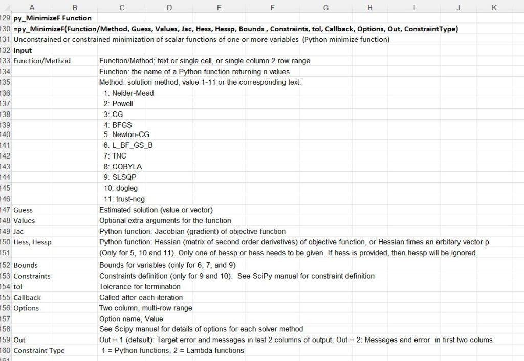 The py_MinimizeF function provides unconstrained or constrained minimization of scalar functions of one or more variables using the Python minimize function, using 11 alternative solver methods.