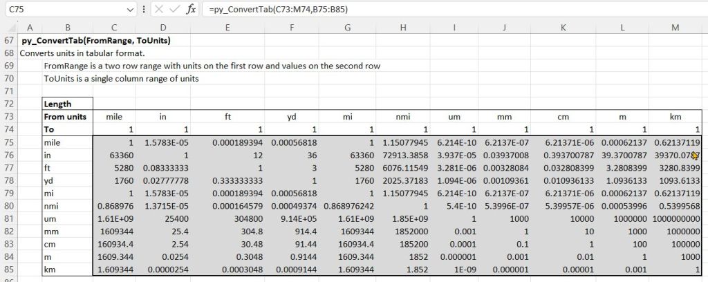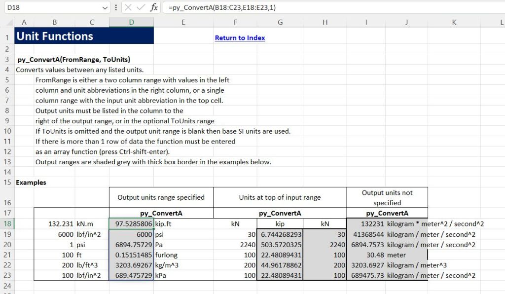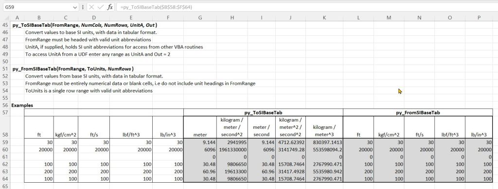 The py_EvalU spreadsheet provides functions for the evaluation of functions entered as text, conversion and evaluation of units, and high precision maths functions. In addition to Numpy and Scipy, the following Python packages should be installed: