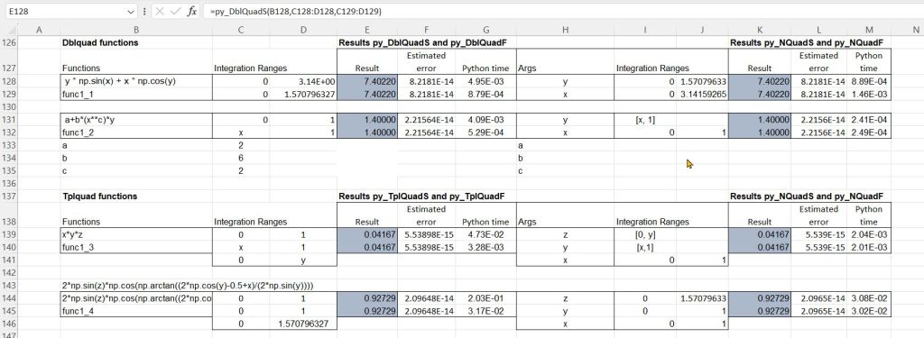 The py_Integrate spreadsheet links to the Scipy quadrature functions. In addition, a Python version of the VBA Quad_Tanh_Sinh function by Graham Dennes has been added. See Tanh-Sinh Quadrature v. 5.03 for details and download of the VBA version.