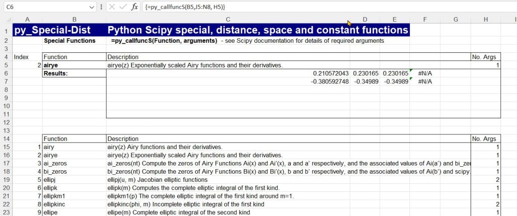 The Scipy special functions are called with the py_CallfuncS function. The spreadsheet lists the 220 available functions with a description, and is set up to generate simple examples: