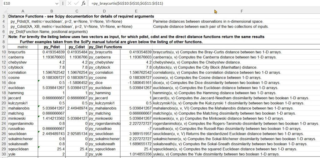 The coded Scipy documentation can be displayed in Excel, using the get_docs function: