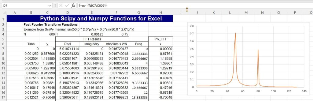 The py_FFT spreadsheet has an example from the Scipy documentation, using the functions py_fft, py_fftfreq, and py_ifft: