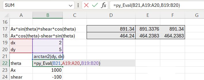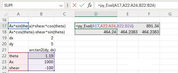 The angle theta is then used by py_Eval with the axial and shear forces to evaluate the formulas in cells A17 and A18: