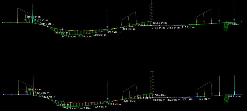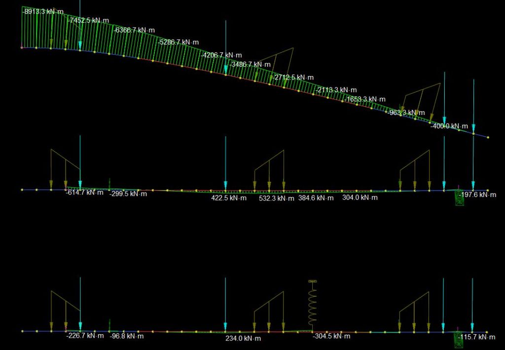 - Three spans with cantilevers at each end and supports fixed or with spring stiffness for translation and rotation, or a specified vertical displacement.