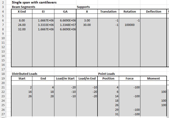 Data input for the single span beam is shown below. The same loads and beam segment lengths and EI values were used in all analyses. The supports were adjusted as required, and the section GA values were set to zero for the beam not including shear deflections.