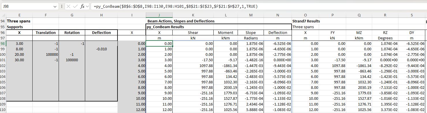 The last post in the current series compares results from the py_Conbeam function with beam analysis results from the Strand7 FEA software.