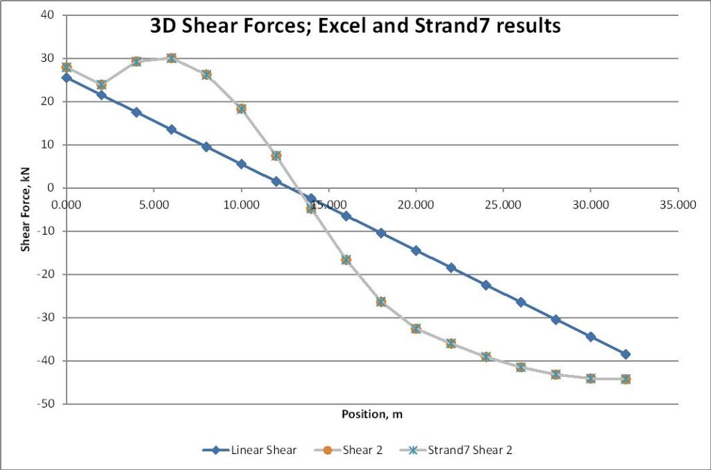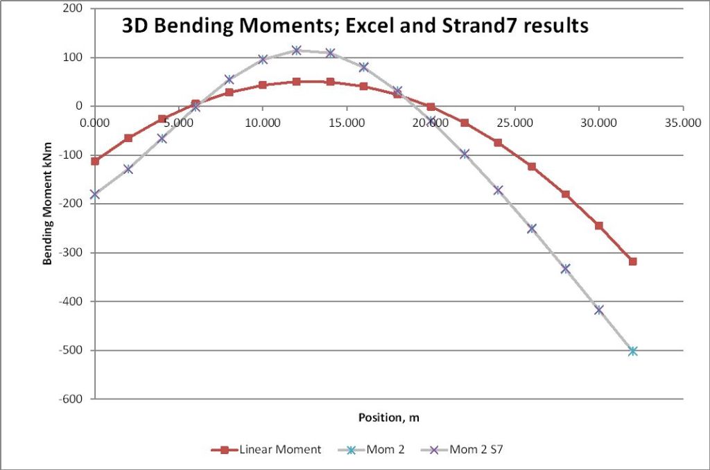 Output results (for the first 12 metres) are shown below for a linear analysis, ignoring geometric non-linear effects: