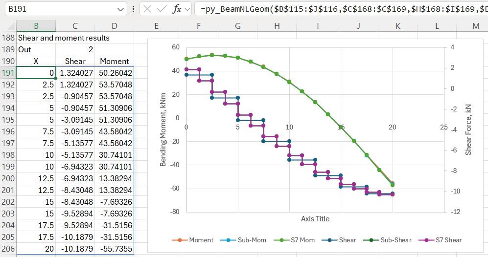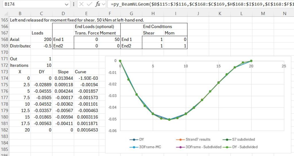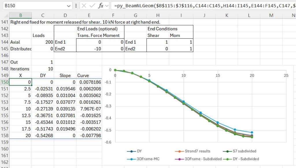 The screenshots below show results with end point loads, compared with results from Strand7 and the 3DFrame spreadsheet: