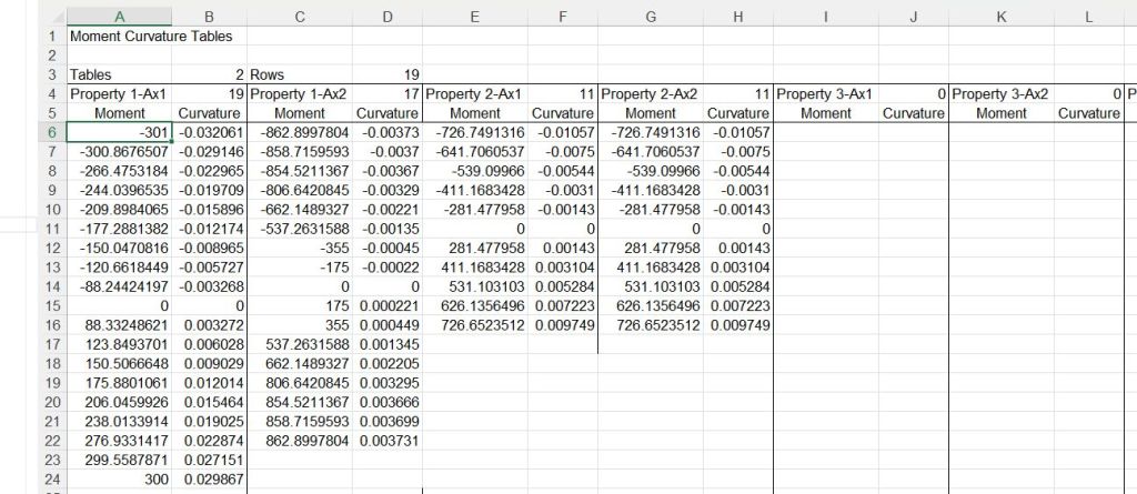 For moment-curvature non-linearity to be included, moment curvature tables must be added to the new Input3 sheet, and the table allocated to each property type added in the new “MomCurve Table” column on the right.