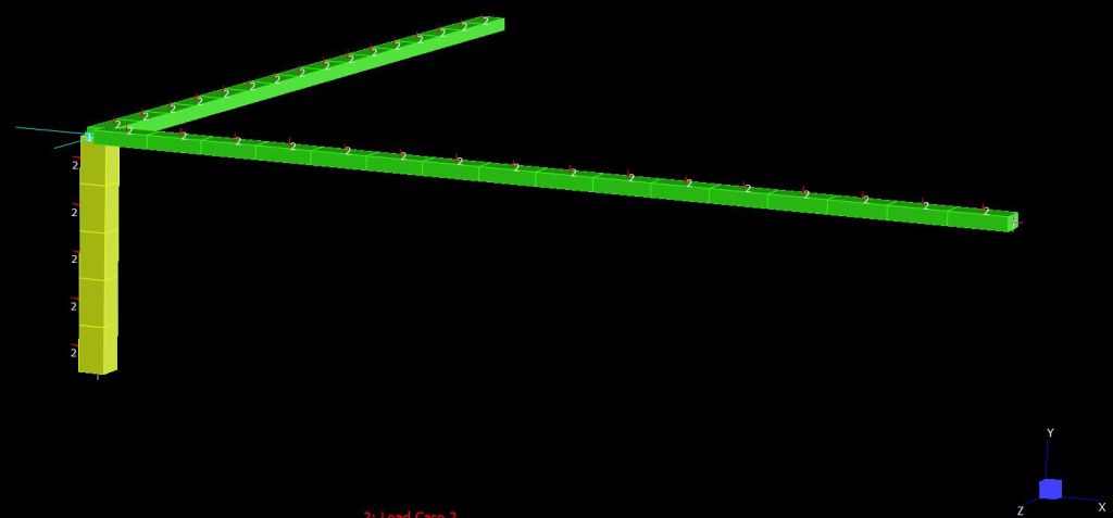 The non-linear code has been checked against Strand7 analyses for the frame below, with high axial loads applied to the horizontal members.