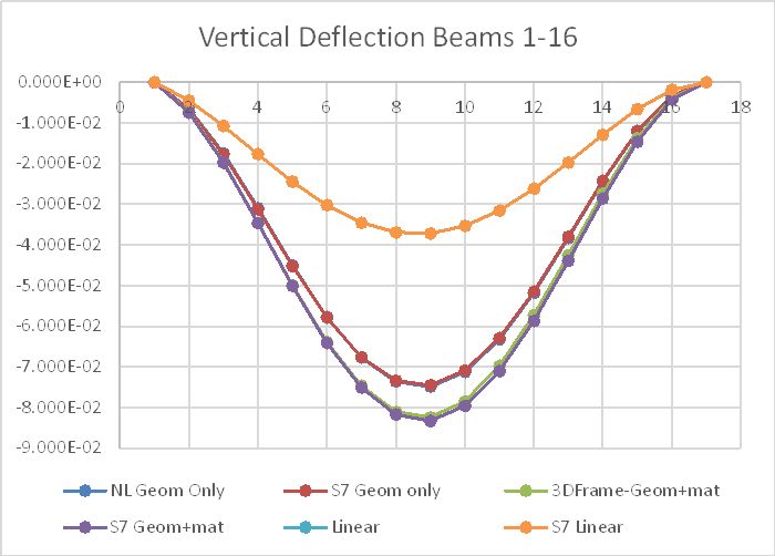 Vertical deflection results are shown below for the linear, non-linear geometry, and non-linear geometry and material effects. It can be seen there is a large increase in deflections due to non-linear effects, with good agreement between the Strand7 and 3DFrame results.