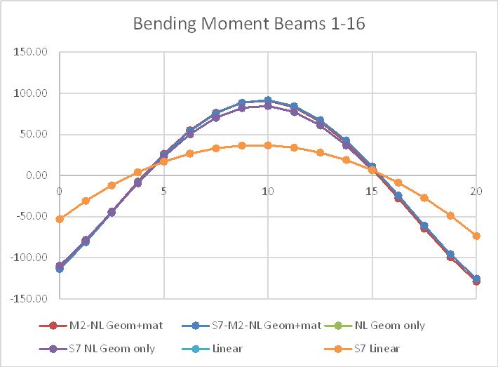 There was also a large increase in bending moments in the geometric non-linear analysis, with a small additional increase from moment-curvature effects. There was again close agreement between the Strand7 and 3DFrame results.