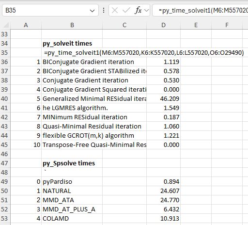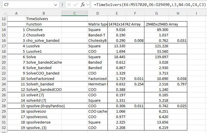 I have updated the Scipy code to remove repeated loading of the Numpy code, and to fix a number of other warnings from the pyxll log file. I have also updated the speed check of the various linear algebra solvers, previously reported at Speed of Scipy Linear Algebra Solvers.