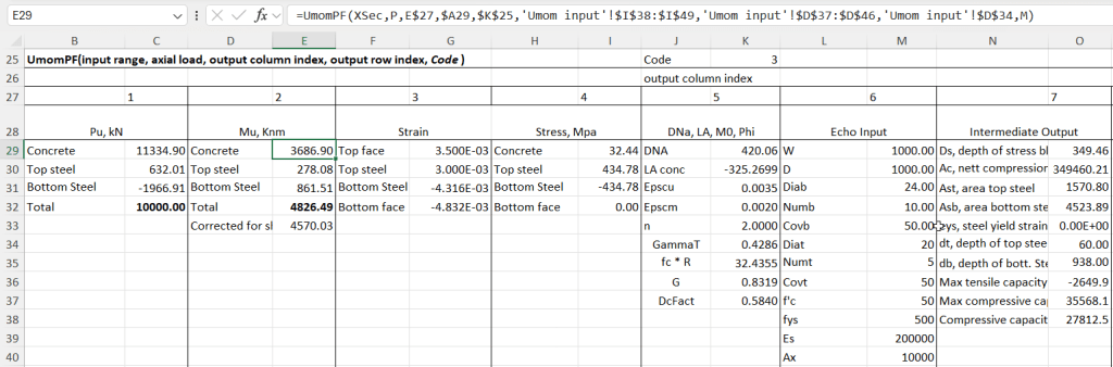 The UMomPF function performs ultimate load analysis for codes using the partial factor approach, including Eurocode 2. The input for Eurocode 2 includes an optional table allowing alternative values to be input for various parameters, including stress reduction factors, and stress block definition values. It was recently pointed out that some of these parameters were having no effect on the results. This has now been fixed, and the revised file has been uploaded to: