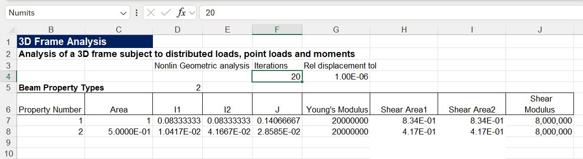 The input for the new 3DFrame-NLGeom spreadsheet allows for setting the maximum number of load iterations and the relative displacement tolerance.