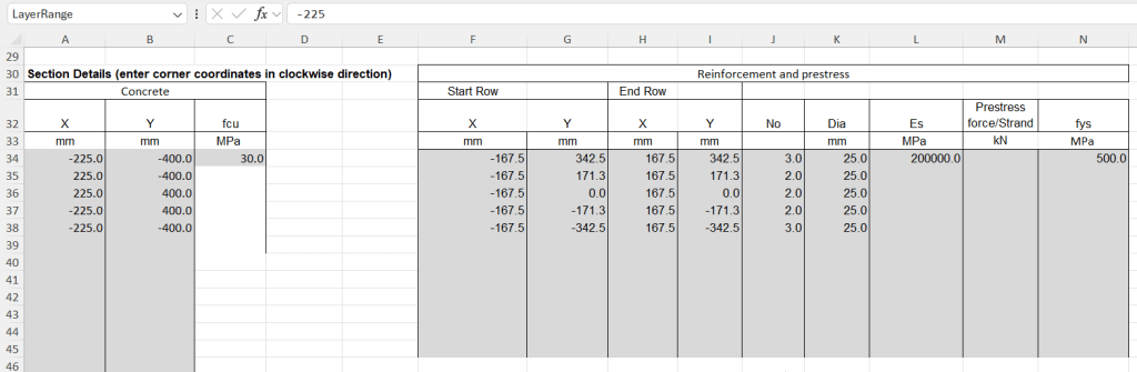 The function allows for irregular cross-sections, defined by coordinates, with any number of reinforcement layers:
