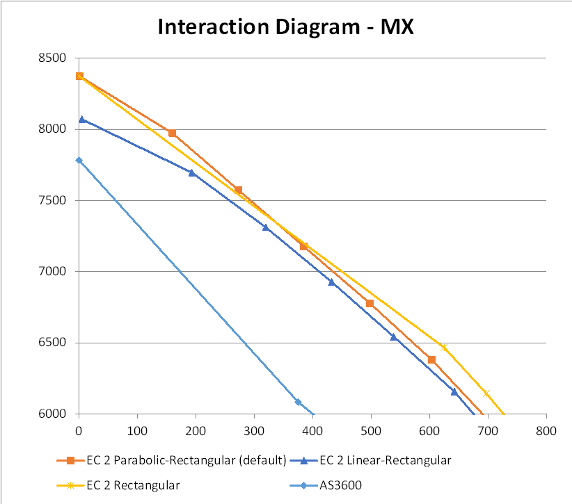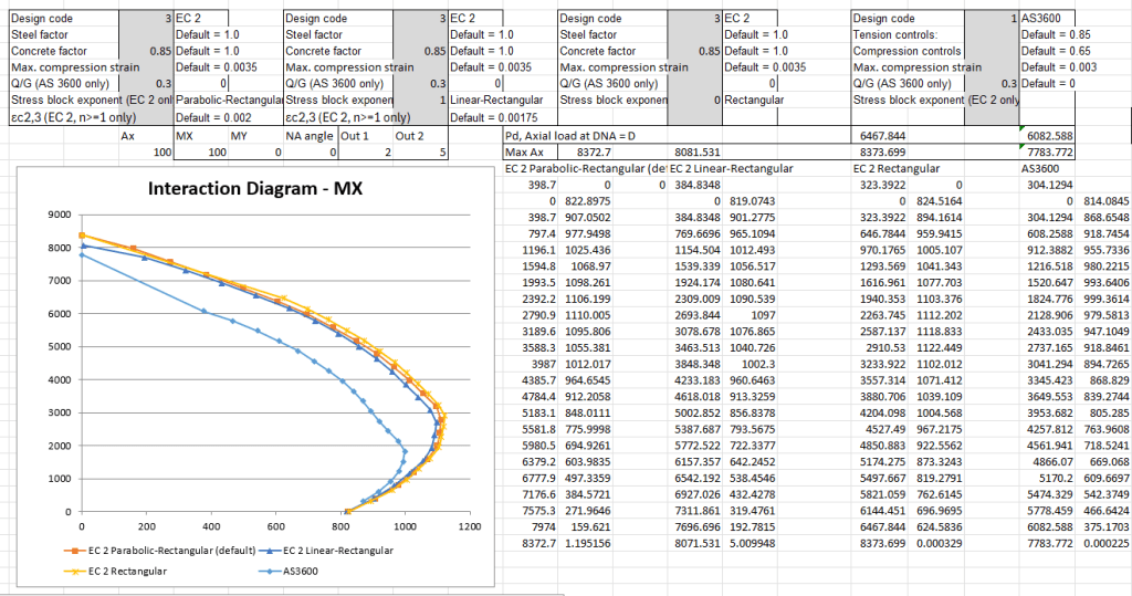 For rectangular stress block calculations the moment capacity is calculated for all axial loads where the neutral axis is inside the section, then linear interpolation is used for results with higher axial load. For parabolic-rectangular and linear-rectangular stress blocks the strain-based calculation is used for all axial loads, using the Eurocode 2 procedure where the maximum compressive strain is reduced as axial loads increase: