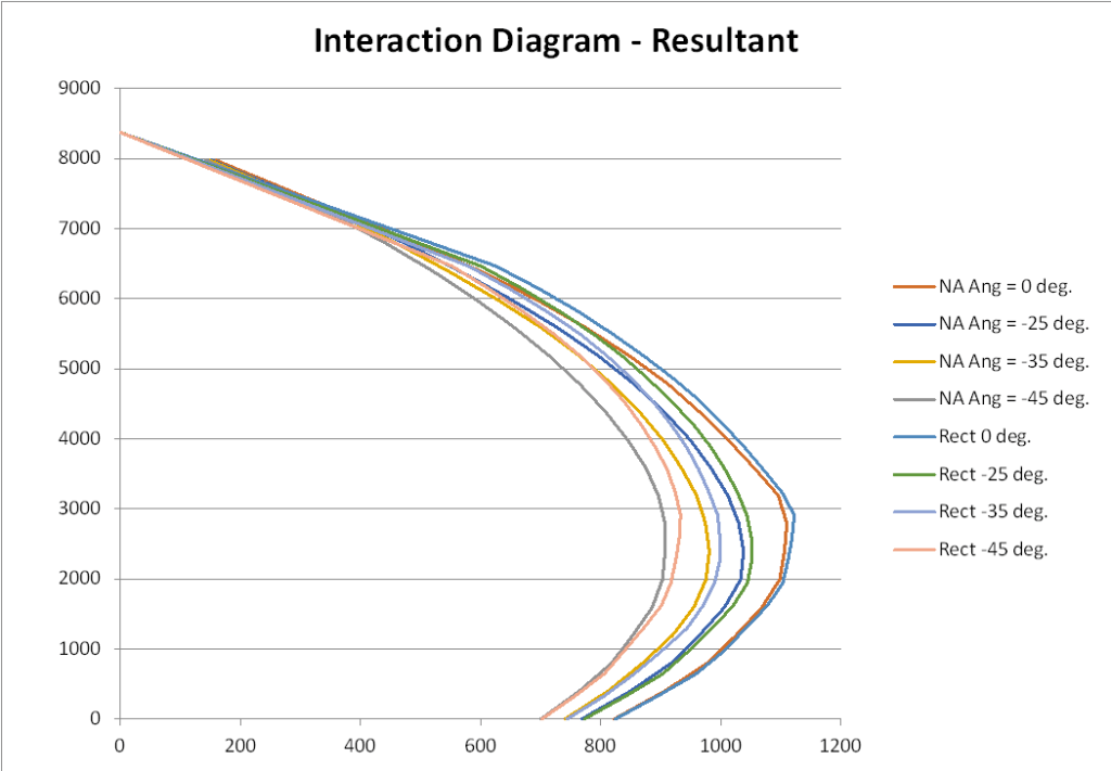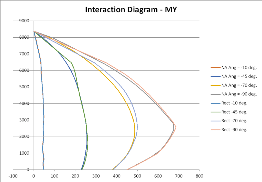 The next example shows moment capacity about the Y axis for different angles of the neutral axis. For each angle results are shown with a parabolic-rectangular and rectangular stress blocks: