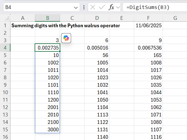 This post looks at an example using pyxll to link from Excel, with code based on another Quora post from Dave Wade-Stein: How many four-digit numbers are there in which the sum of the digits is 3?
