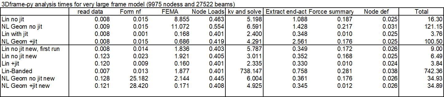 - Total run time for linear analysis with “no jit” code was reduced by half, with the majority of the speed improvement in the code for Fixed End Moment Array (FEMA).