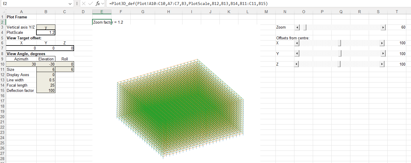 The other main change in the new code is that the VBA code to plot the frame in 3D has been replaced with Python code linking to my Plot3D function (see 3D plots with the latest Matplotlib). This has similar functionality to the VBA code but: