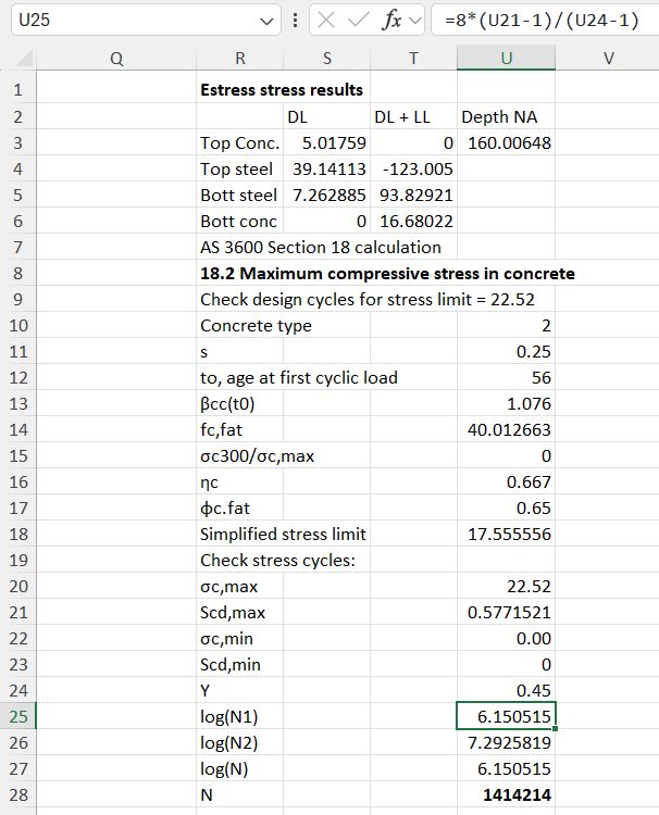 A check has been added to the spreadsheet to verify that the concrete stress limit calculated by the AS 3600 function does correspond with the required number of stress cycles: