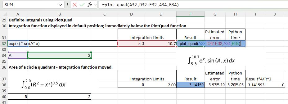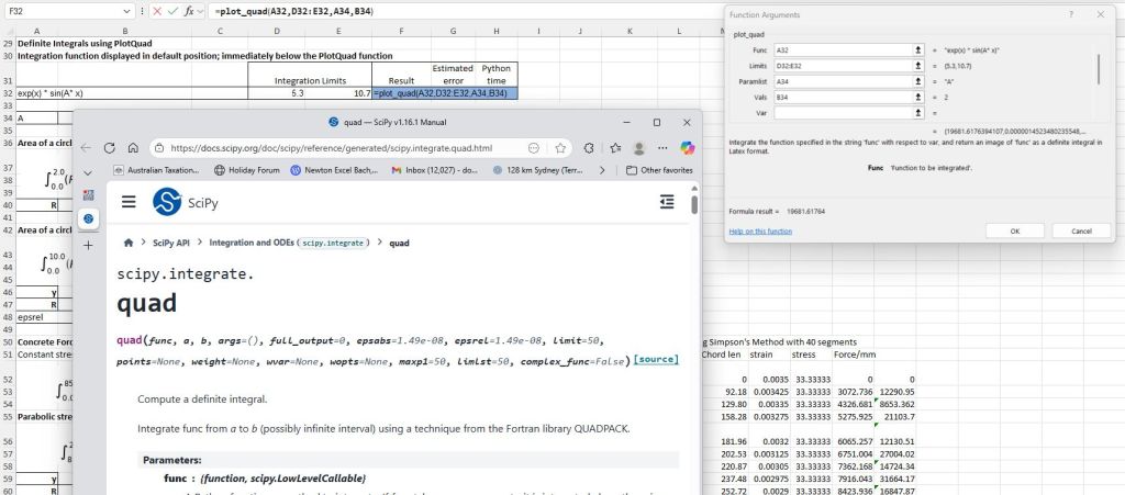 The py_Evalu spreadsheet was last presented at Scipy Functions with Excel and pyxll 5 – Evaluate with Units and included the Plot_Math function, which converts a text string to Latex format, then uses Matplotlib to convert this to a graphic image, and optionally evaluates the function. To extend this functionality I have now added the Plot_Quad function to evaluate and display definite integrals.